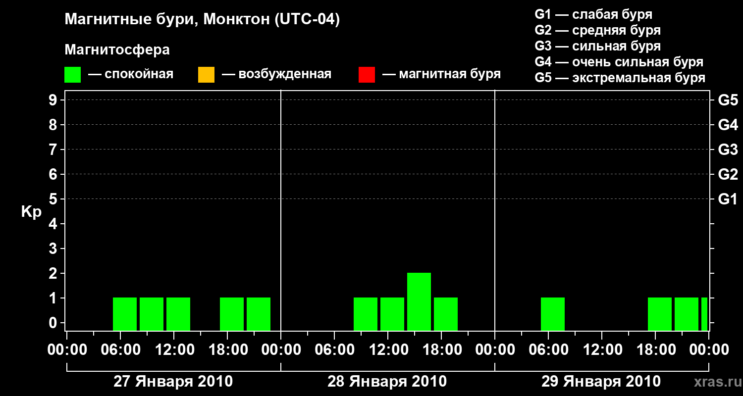 Изменения геомагнитного индекса Kp с 27 по 29 января 2010 года для средних широт