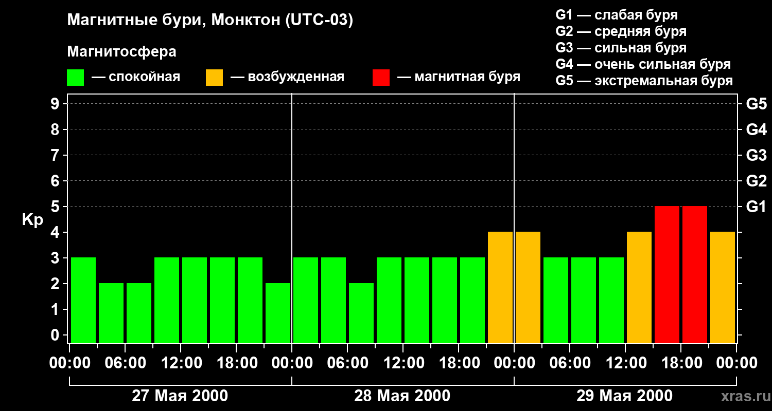 Изменения геомагнитного индекса Kp с 27 по 29 мая 2000 года для средних широт