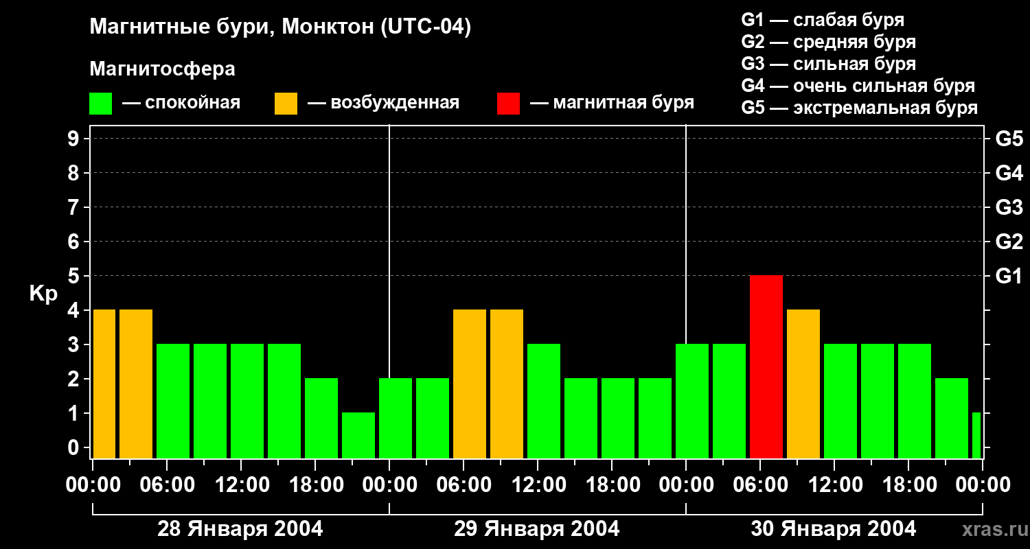 Изменения геомагнитного индекса Kp с 28 по 30 января 2004 года для средних широт