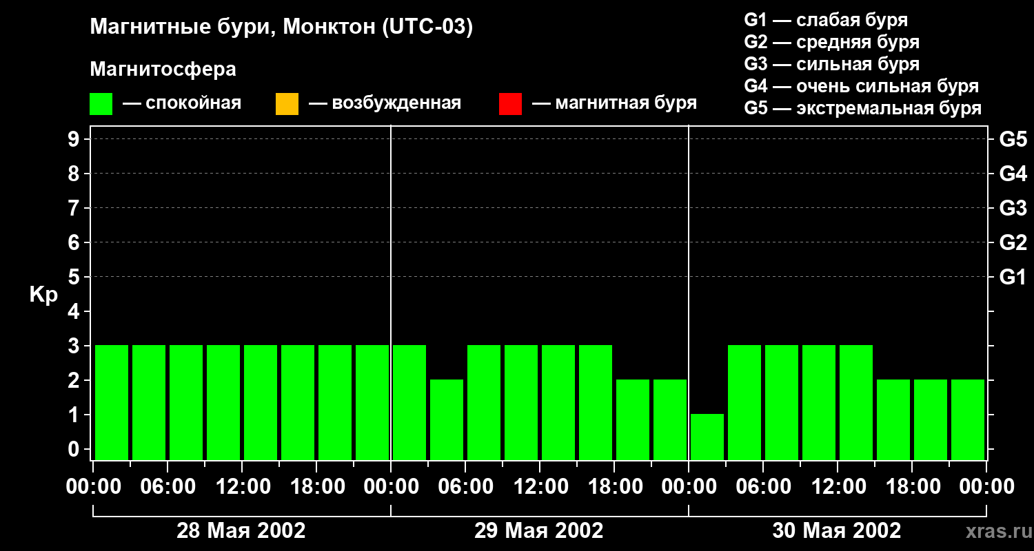 Изменения геомагнитного индекса Kp с 28 по 30 мая 2002 года для средних широт