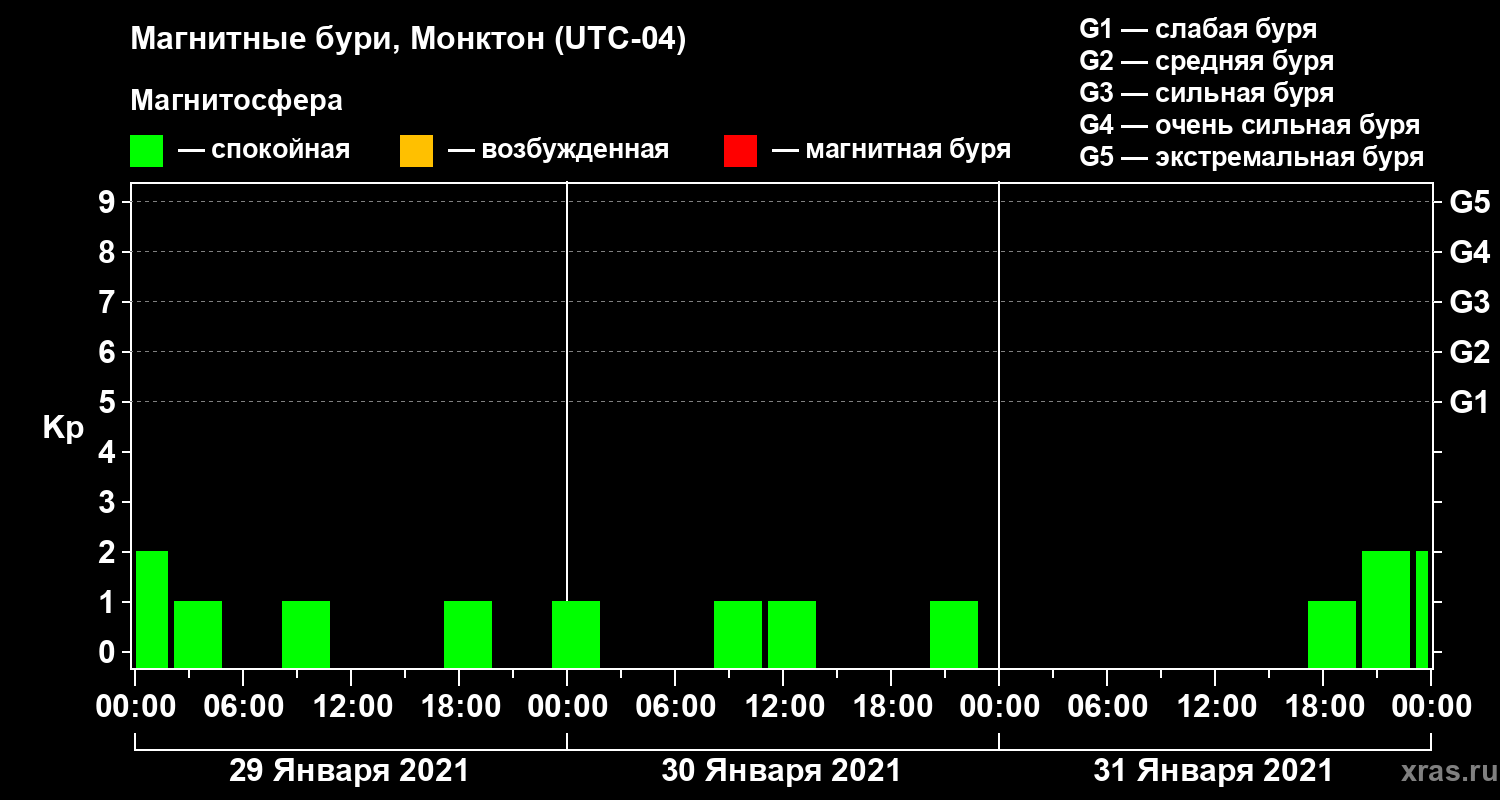 Изменения геомагнитного индекса Kp с 29 по 31 января 2021 года для средних широт