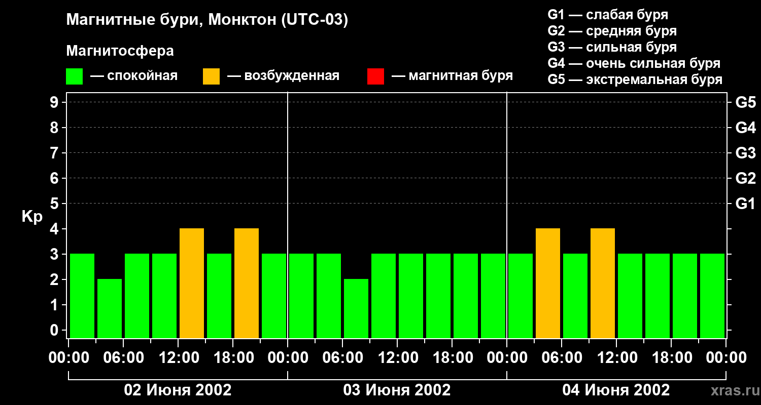 Изменения геомагнитного индекса Kp с 2 по 4 июня 2002 года для средних широт