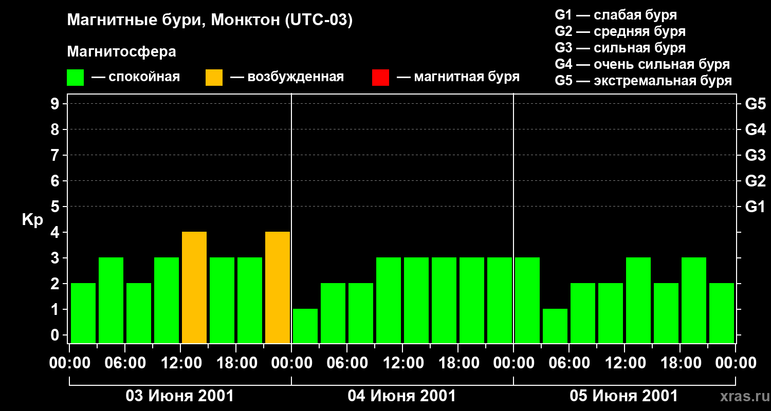 Изменения геомагнитного индекса Kp с 3 по 5 июня 2001 года для средних широт