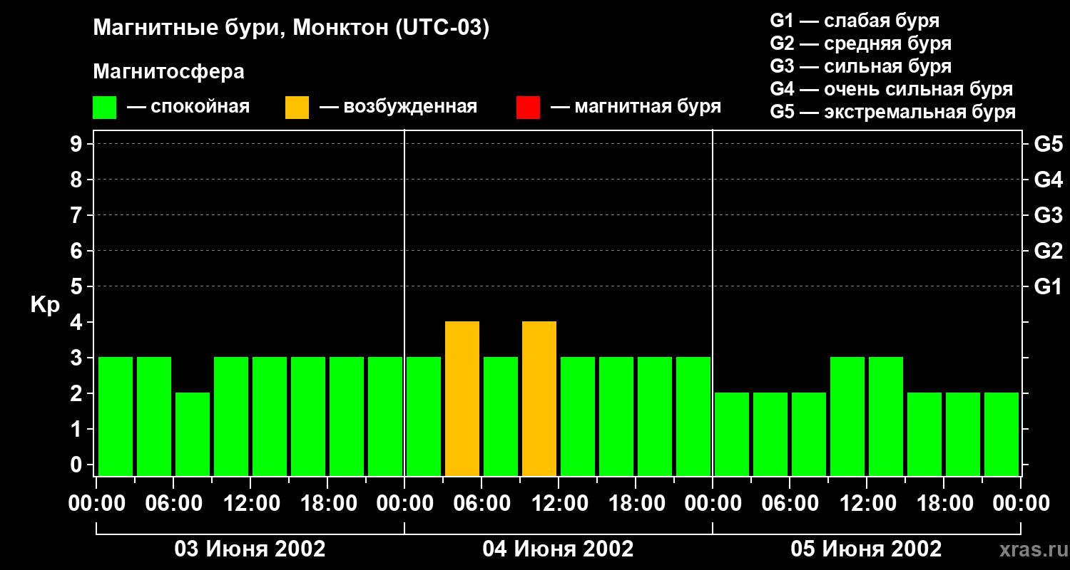 Изменения геомагнитного индекса Kp с 3 по 5 июня 2002 года для средних широт