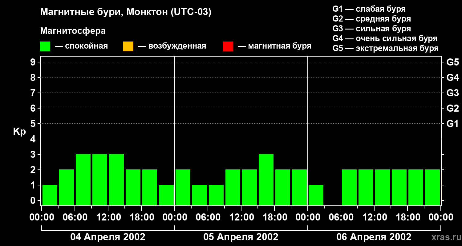 Изменения геомагнитного индекса Kp с 4 по 6 апреля 2002 года для средних широт
