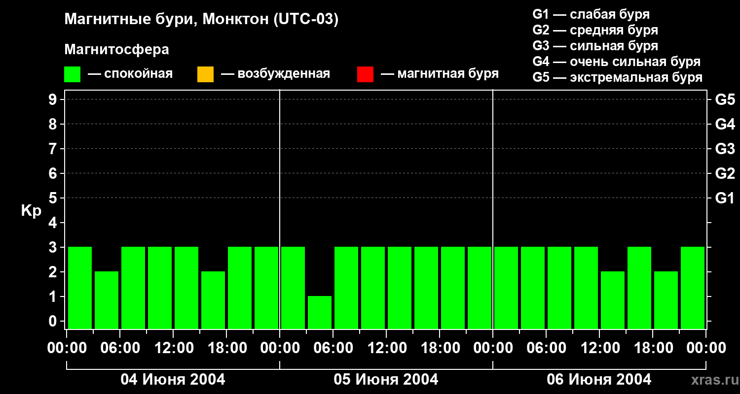 Изменения геомагнитного индекса Kp с 4 по 6 июня 2004 года для средних широт