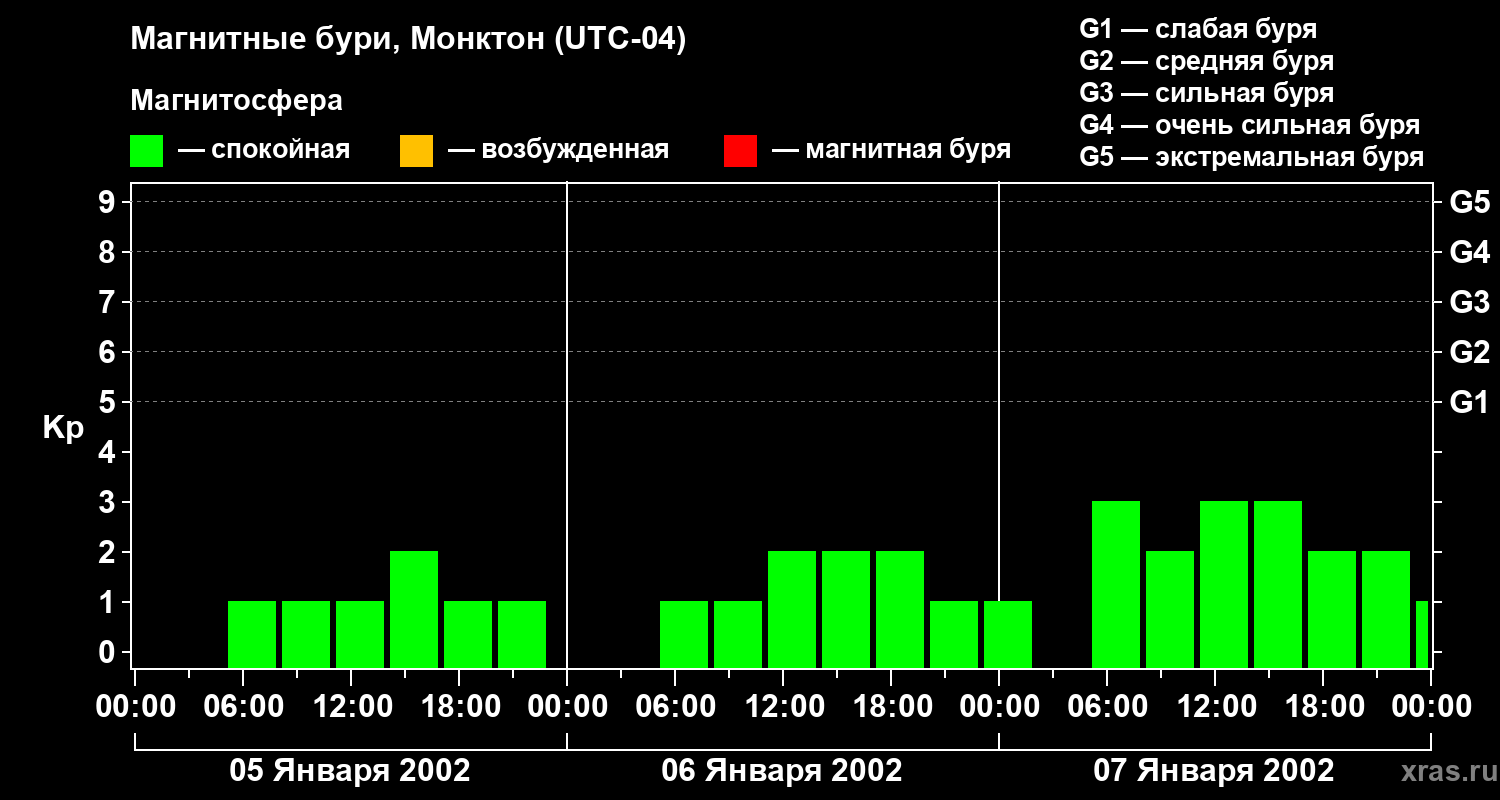 Изменения геомагнитного индекса Kp с 5 по 7 января 2002 года для средних широт