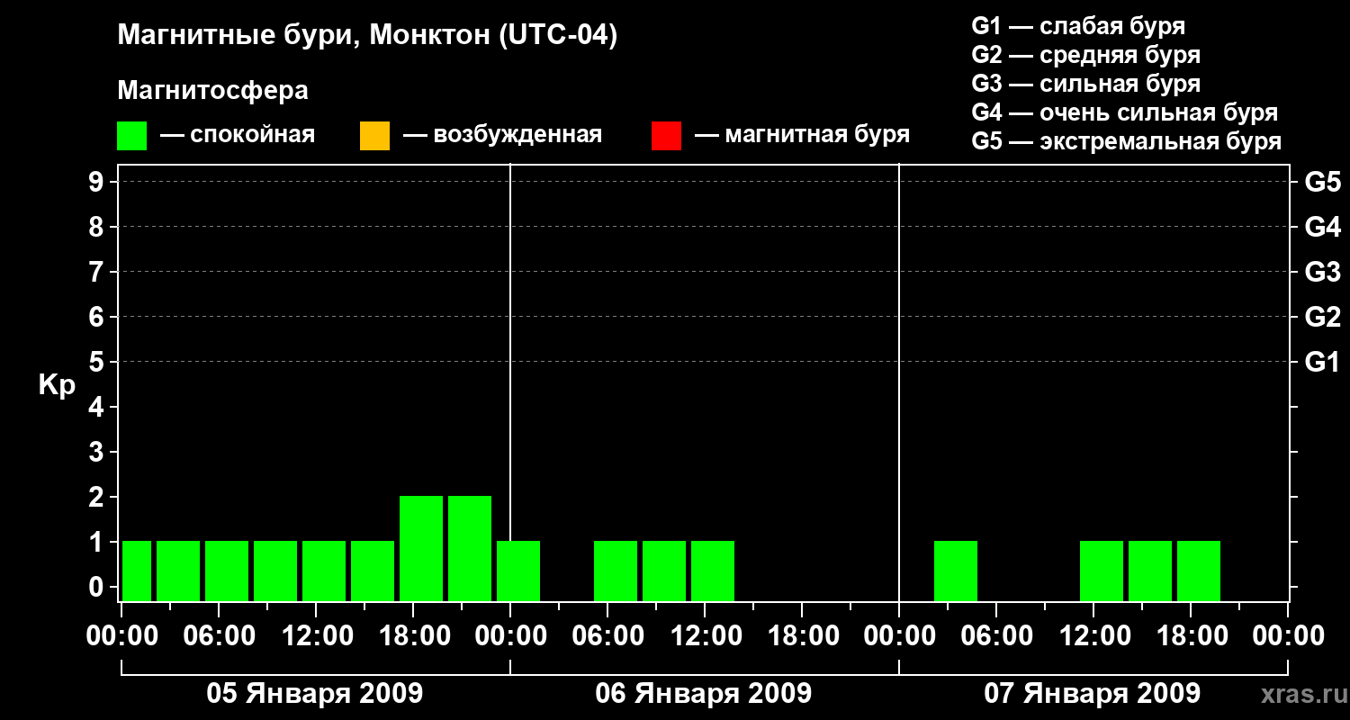Изменения геомагнитного индекса Kp с 5 по 7 января 2009 года для средних широт