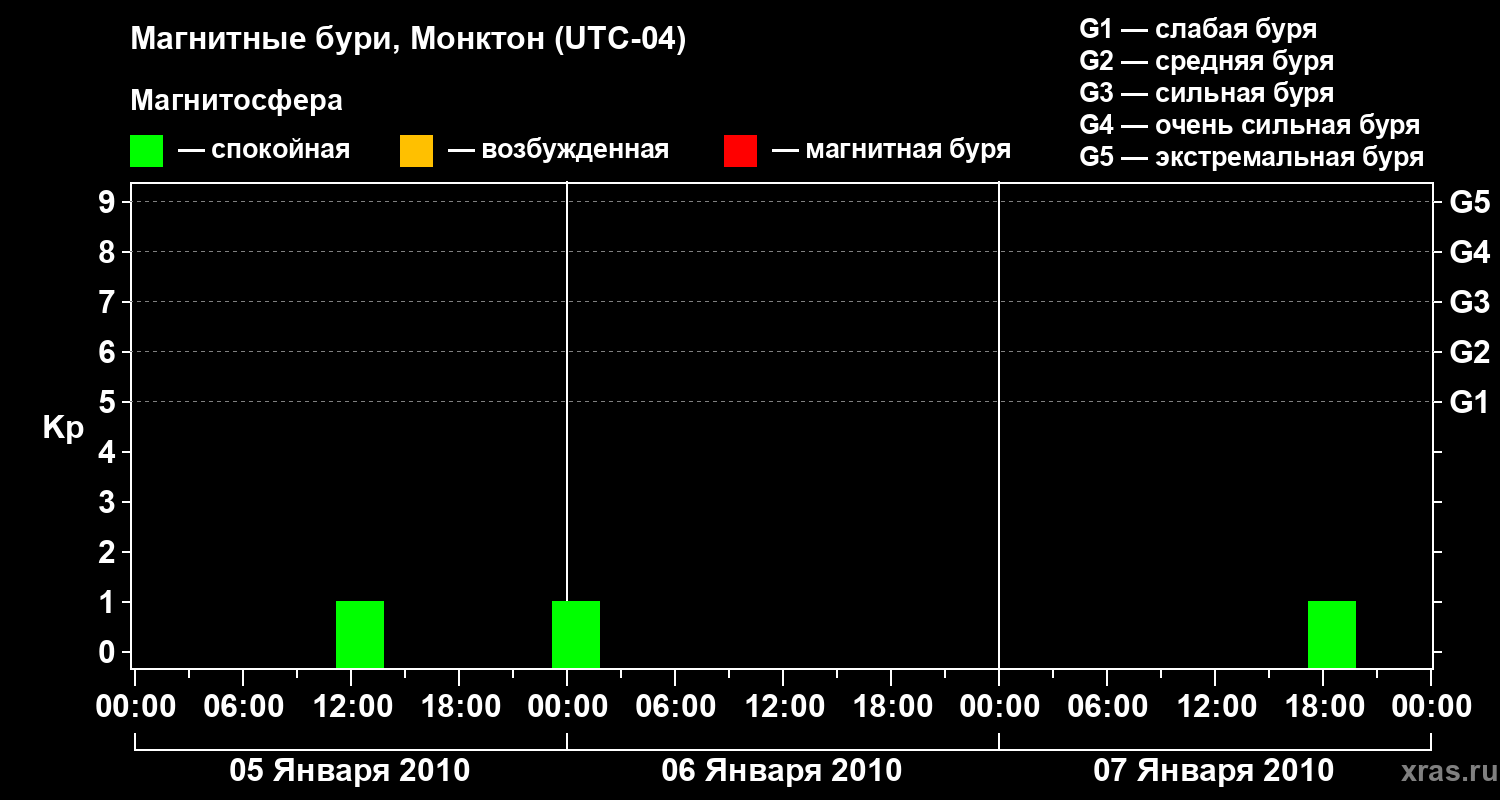 Изменения геомагнитного индекса Kp с 5 по 7 января 2010 года для средних широт