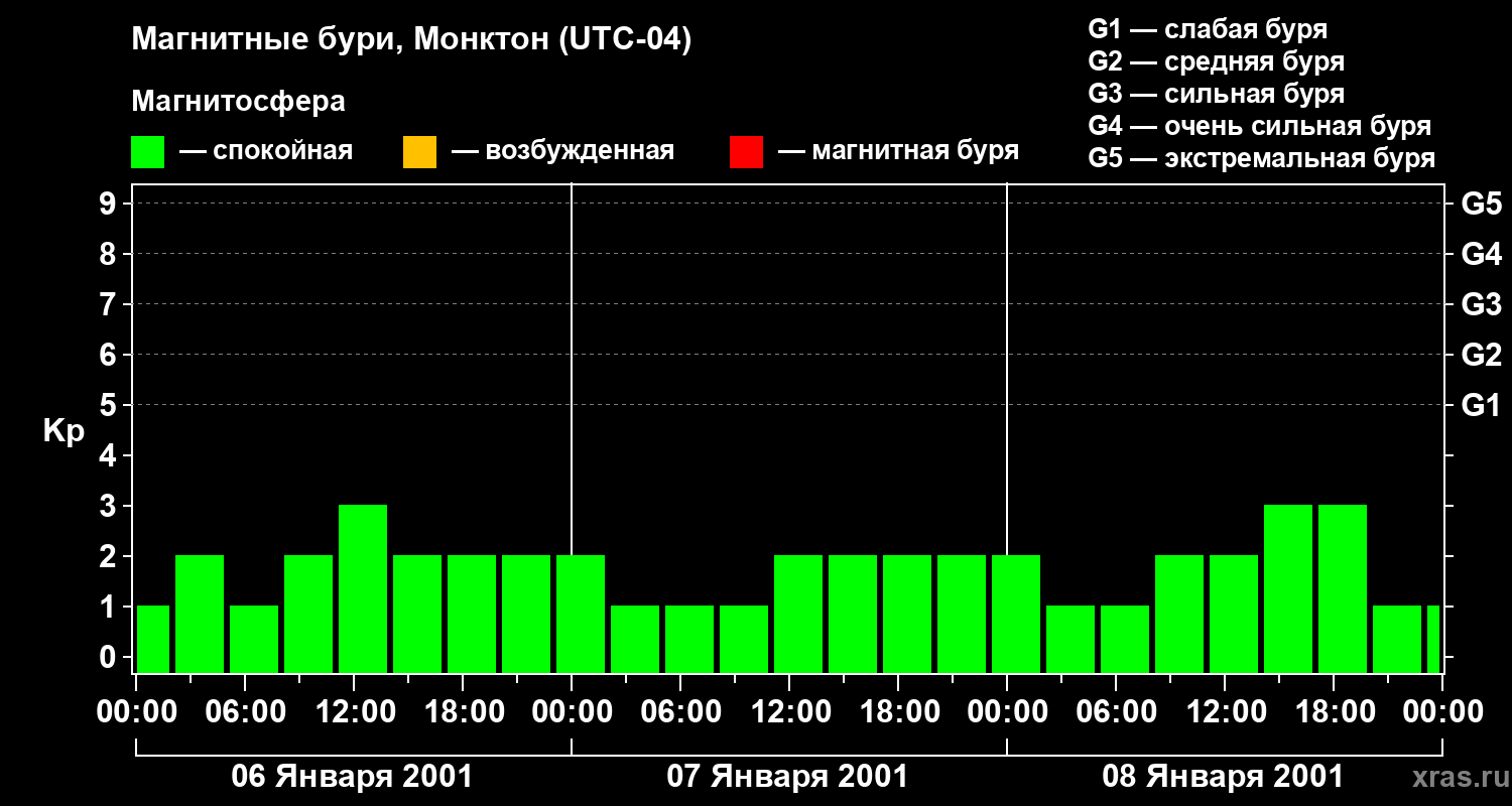 Изменения геомагнитного индекса Kp с 6 по 8 января 2001 года для средних широт
