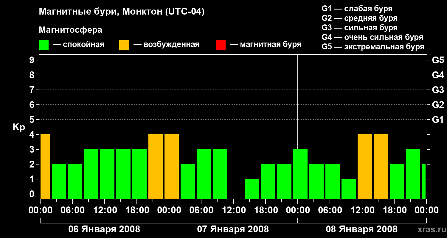 Изменения геомагнитного индекса Kp с 6 по 8 января 2008 года для средних широт