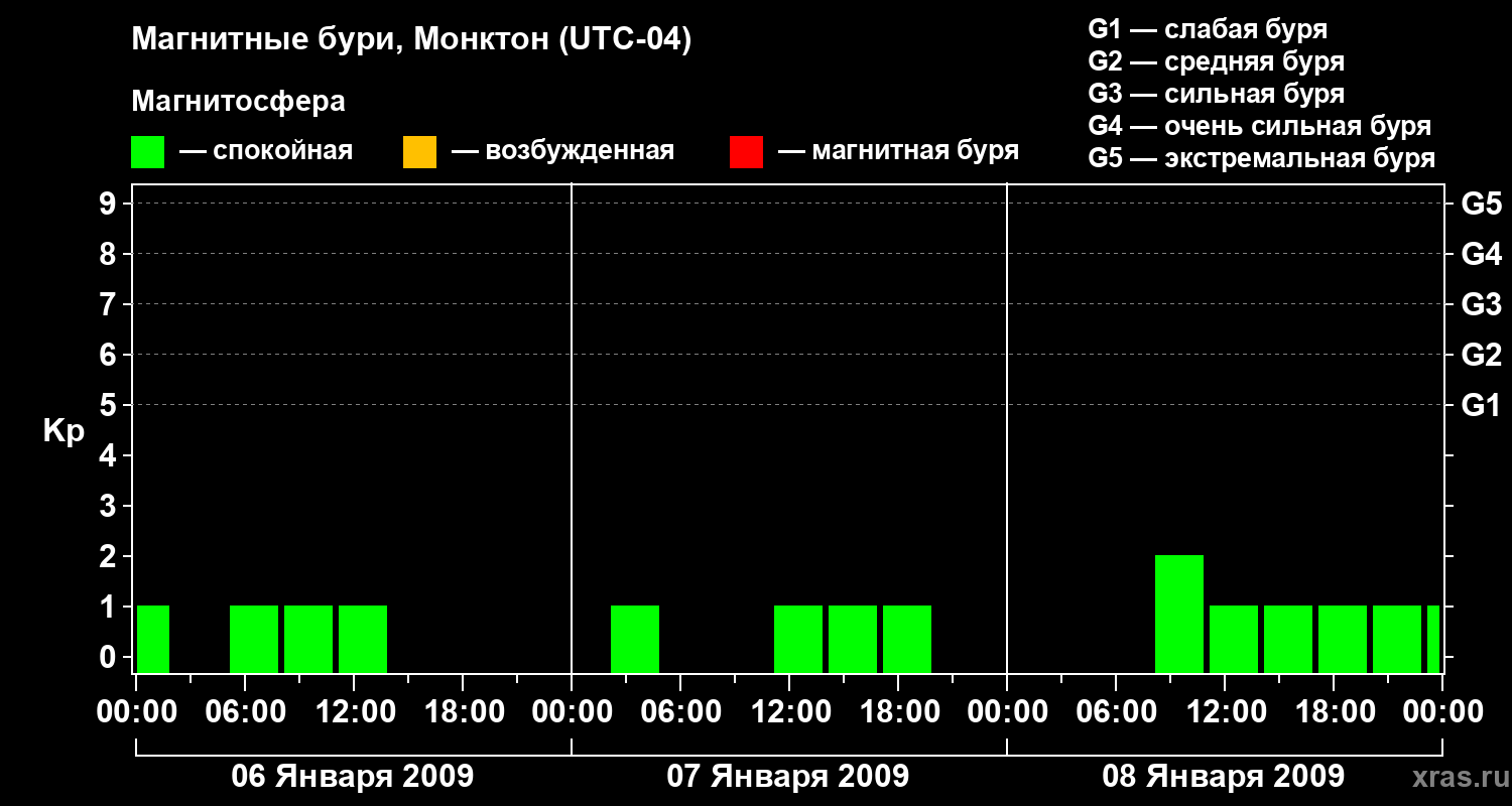 Изменения геомагнитного индекса Kp с 6 по 8 января 2009 года для средних широт