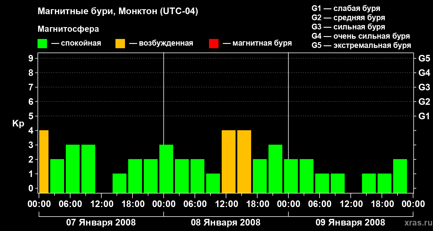 Изменения геомагнитного индекса Kp с 7 по 9 января 2008 года для средних широт
