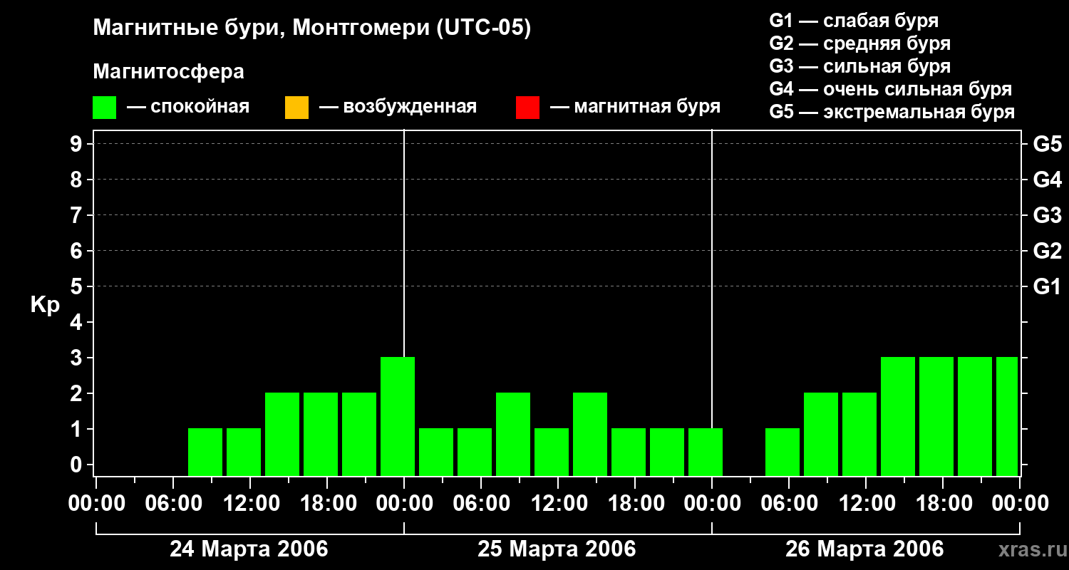 Изменения геомагнитного индекса Kp с 24 по 26 марта 2006 года для средних широт