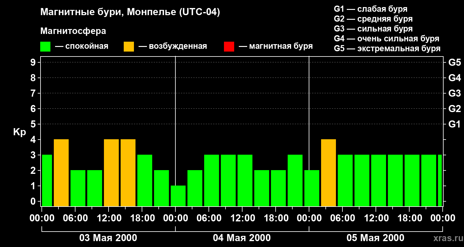 Изменения геомагнитного индекса Kp с 3 по 5 мая 2000 года для средних широт