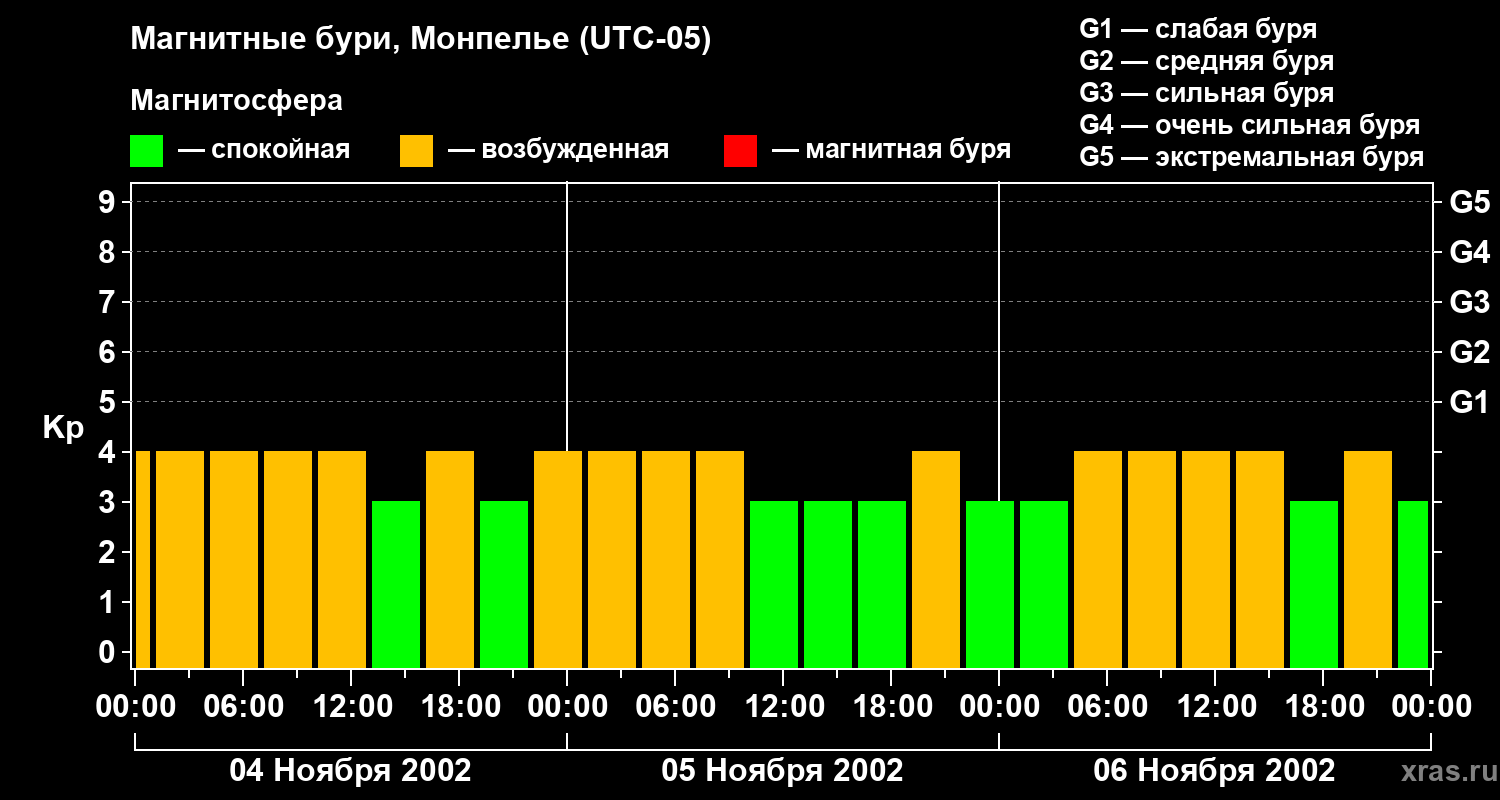 Изменения геомагнитного индекса Kp с 4 по 6 ноября 2002 года для средних широт