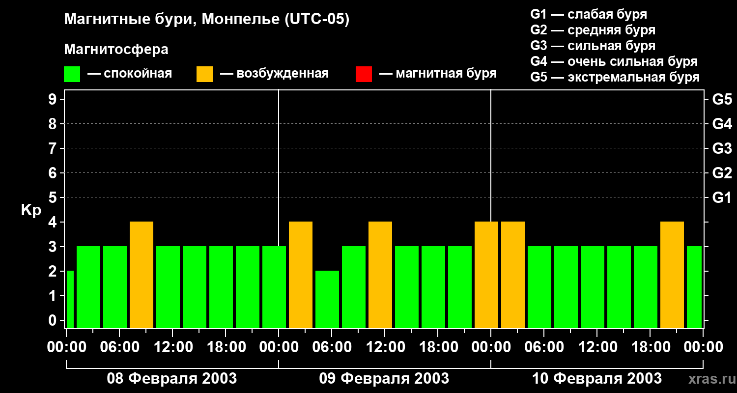 Изменения геомагнитного индекса Kp с 8 по 10 февраля 2003 года для средних широт
