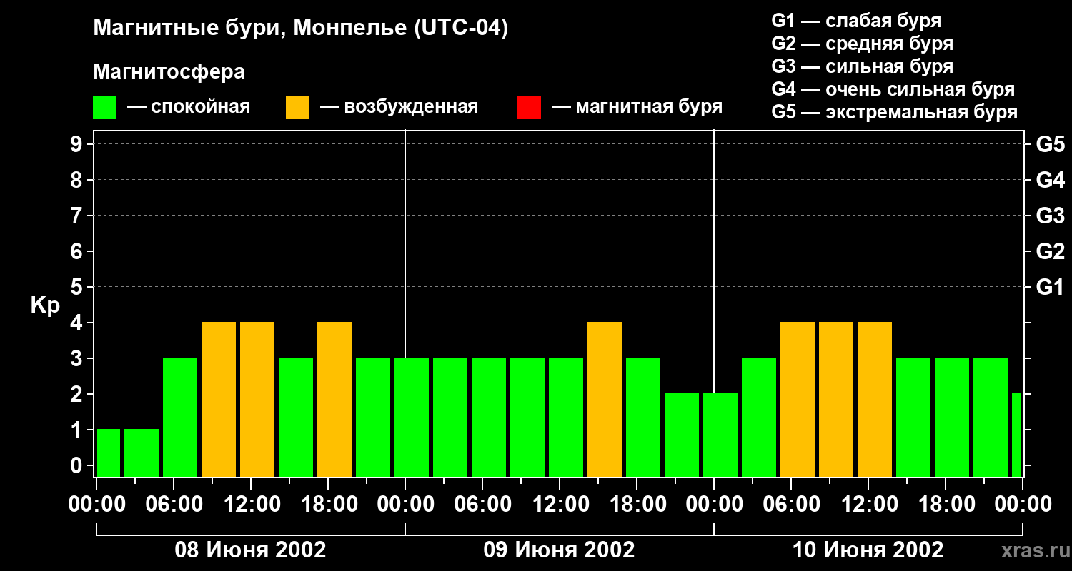 Изменения геомагнитного индекса Kp с 8 по 10 июня 2002 года для средних широт