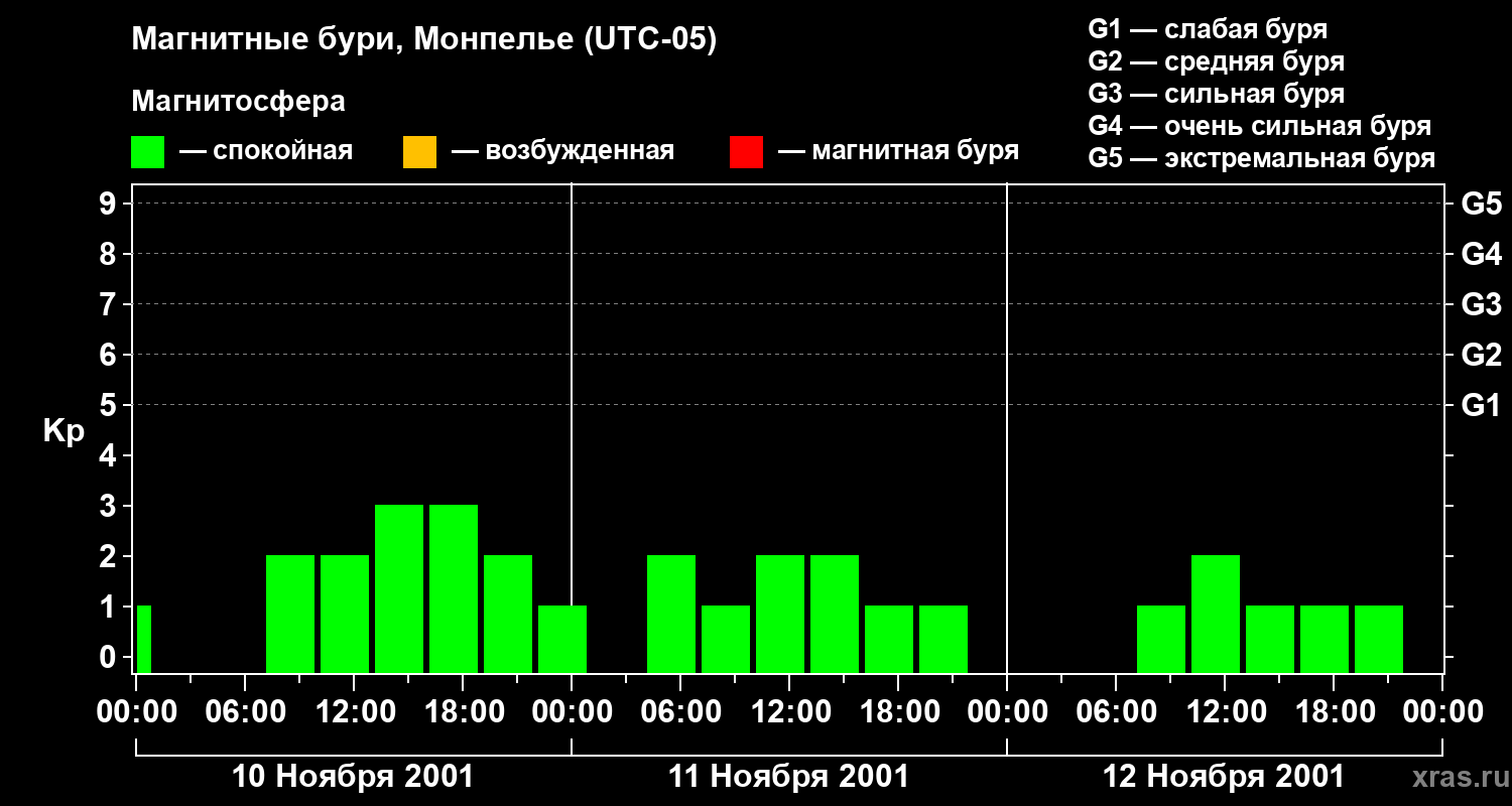 Изменения геомагнитного индекса Kp с 10 по 12 ноября 2001 года для средних широт