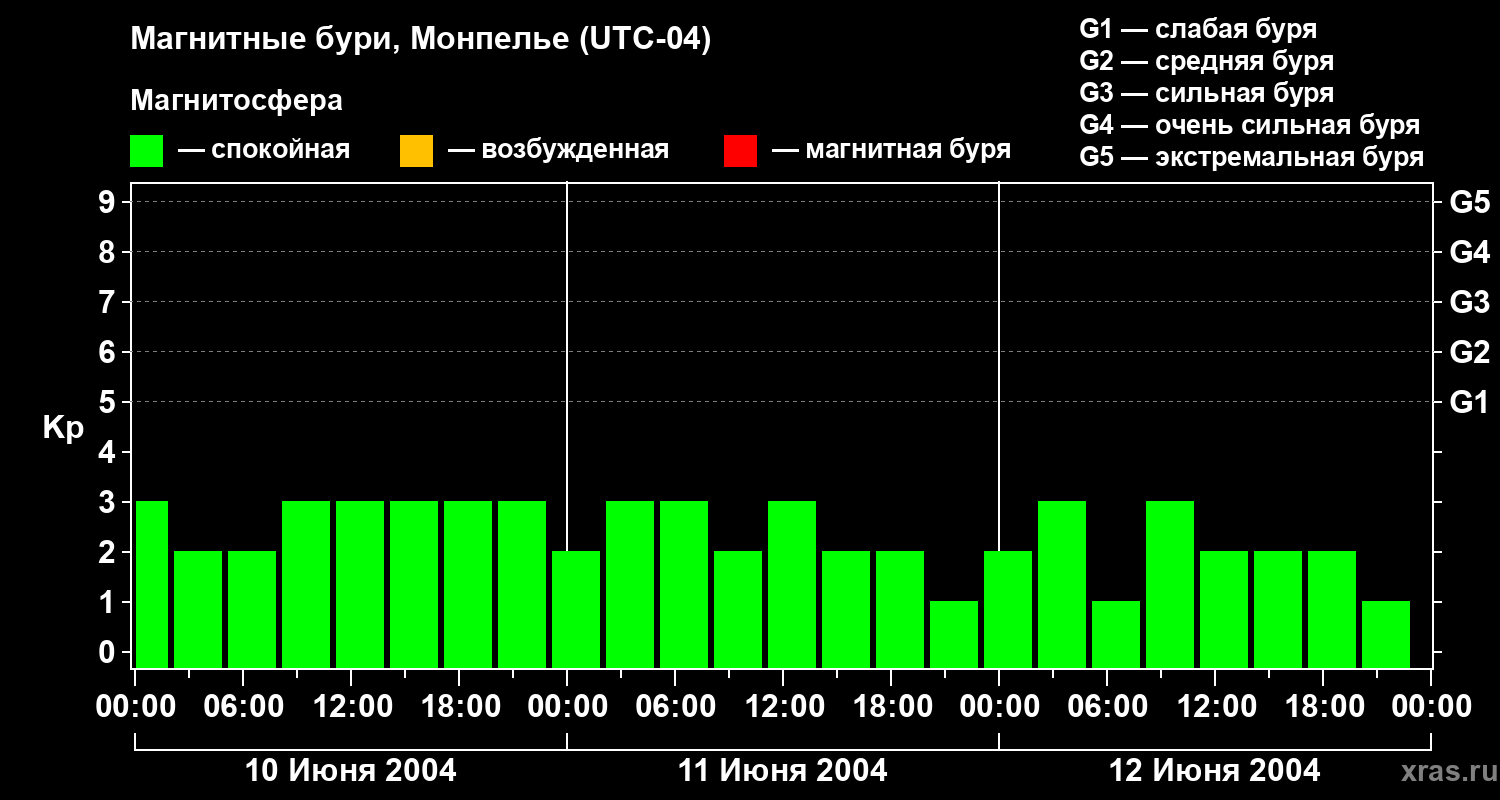 Изменения геомагнитного индекса Kp с 10 по 12 июня 2004 года для средних широт