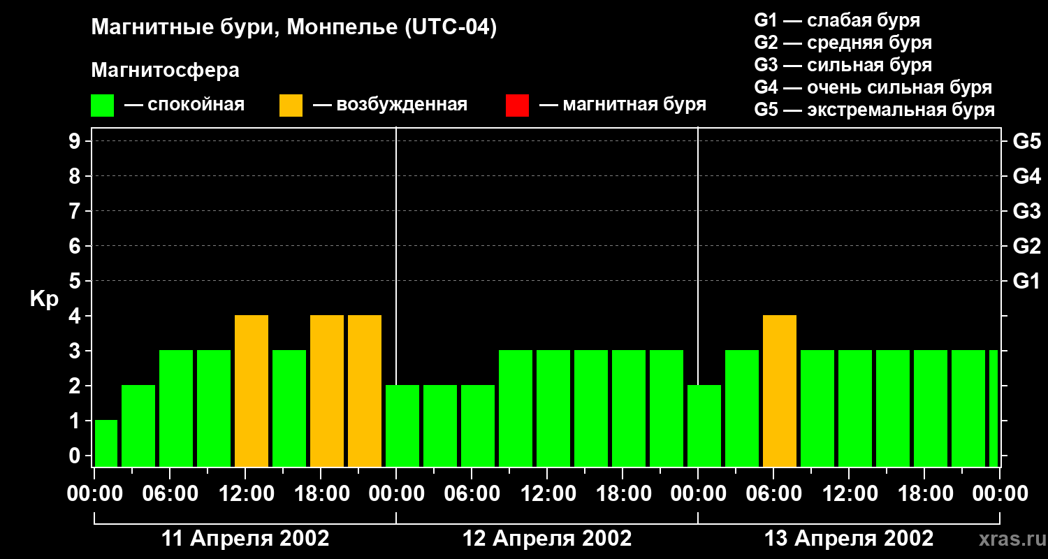 Изменения геомагнитного индекса Kp с 11 по 13 апреля 2002 года для средних широт