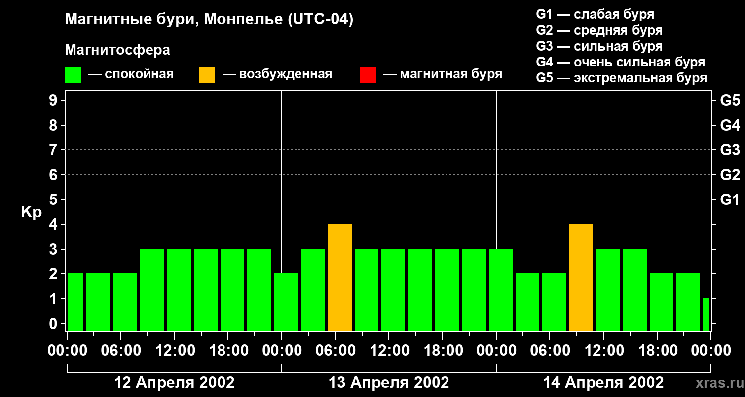 Изменения геомагнитного индекса Kp с 12 по 14 апреля 2002 года для средних широт