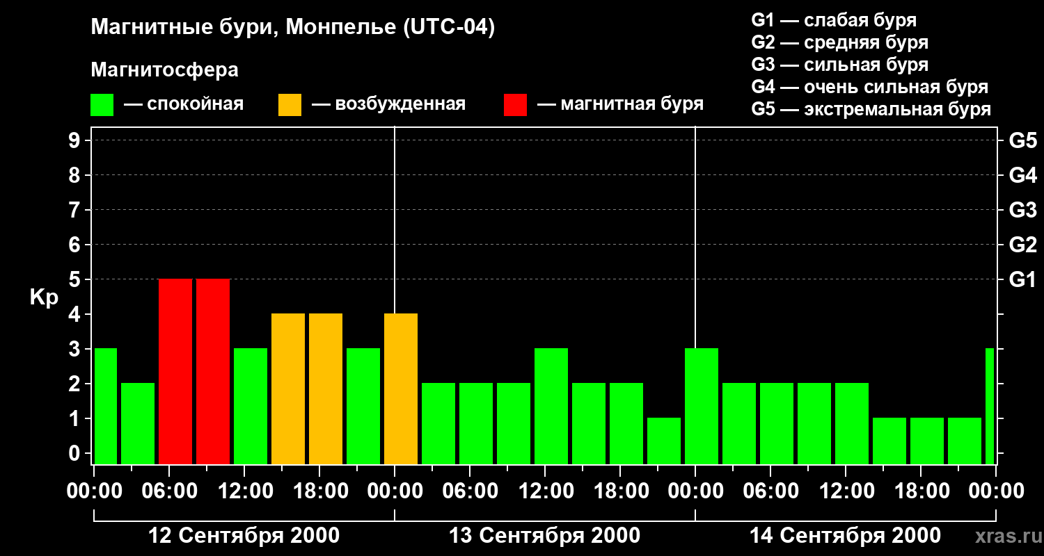Изменения геомагнитного индекса Kp с 12 по 14 сентября 2000 года для средних широт