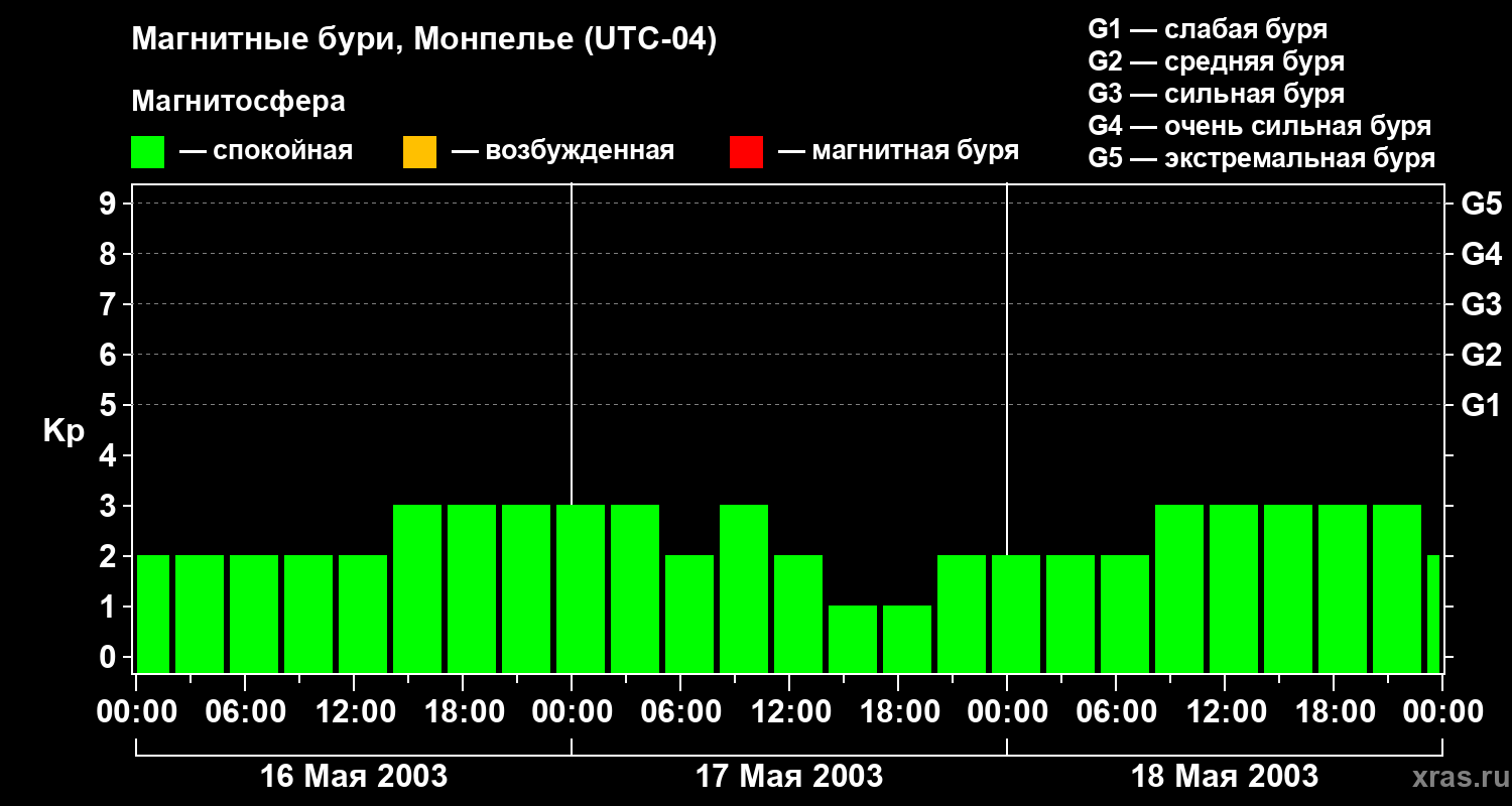Изменения геомагнитного индекса Kp с 16 по 18 мая 2003 года для средних широт