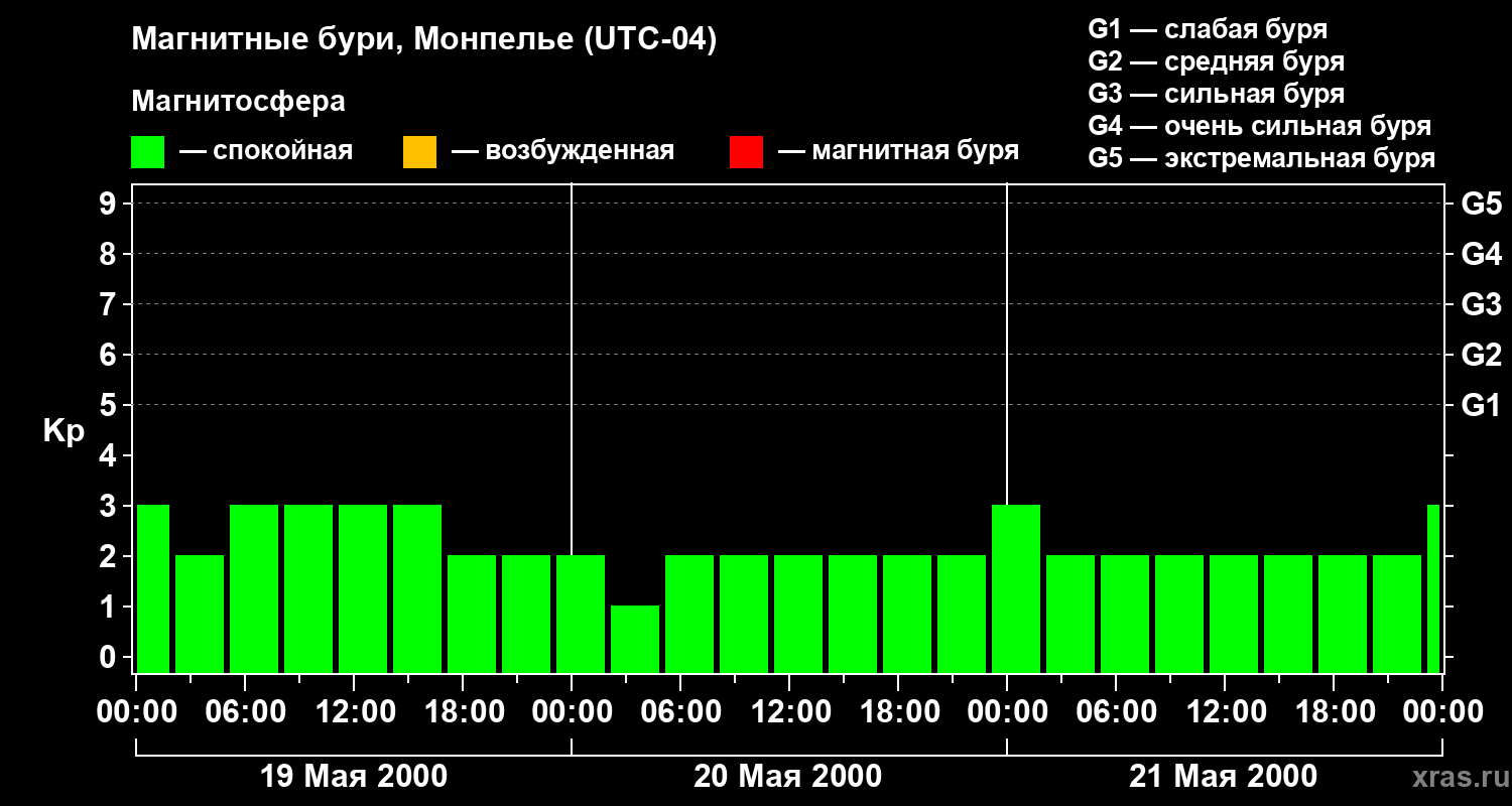 Изменения геомагнитного индекса Kp с 19 по 21 мая 2000 года для средних широт