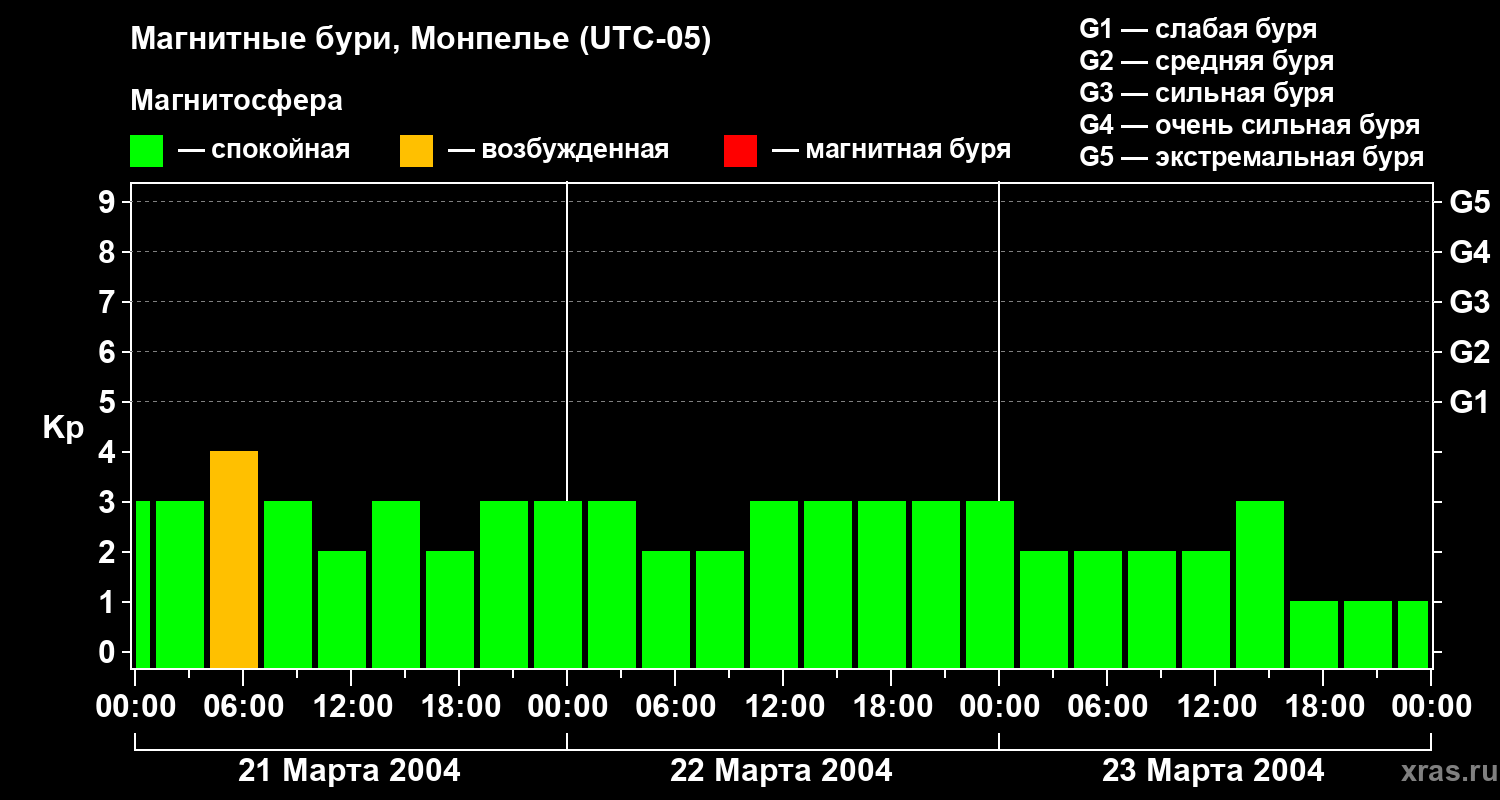 Изменения геомагнитного индекса Kp с 21 по 23 марта 2004 года для средних широт