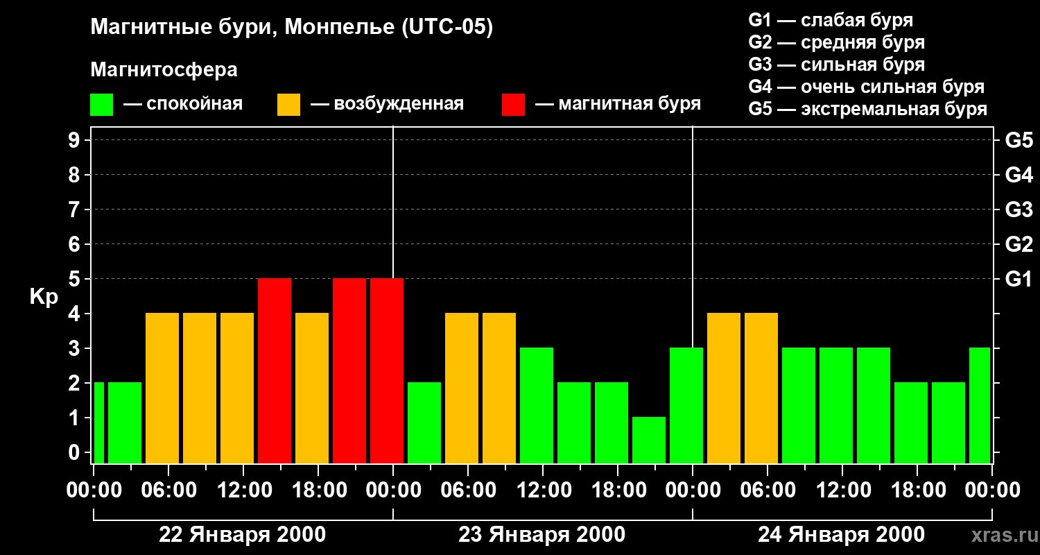 Изменения геомагнитного индекса Kp с 22 по 24 января 2000 года для средних широт