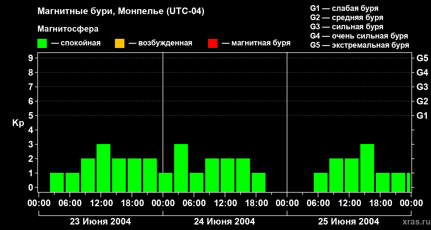 Изменения геомагнитного индекса Kp с 23 по 25 июня 2004 года для средних широт
