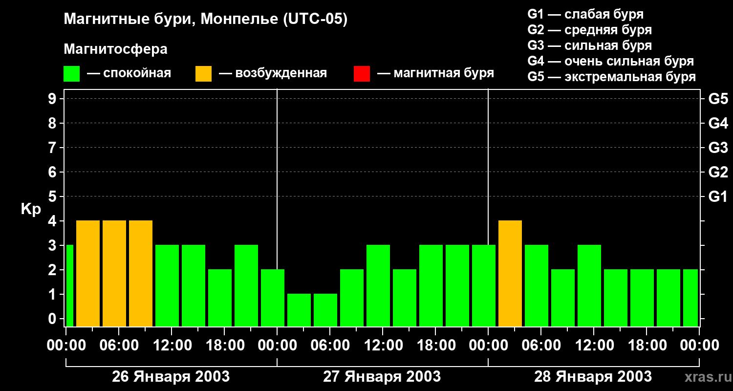 Изменения геомагнитного индекса Kp с 26 по 28 января 2003 года для средних широт