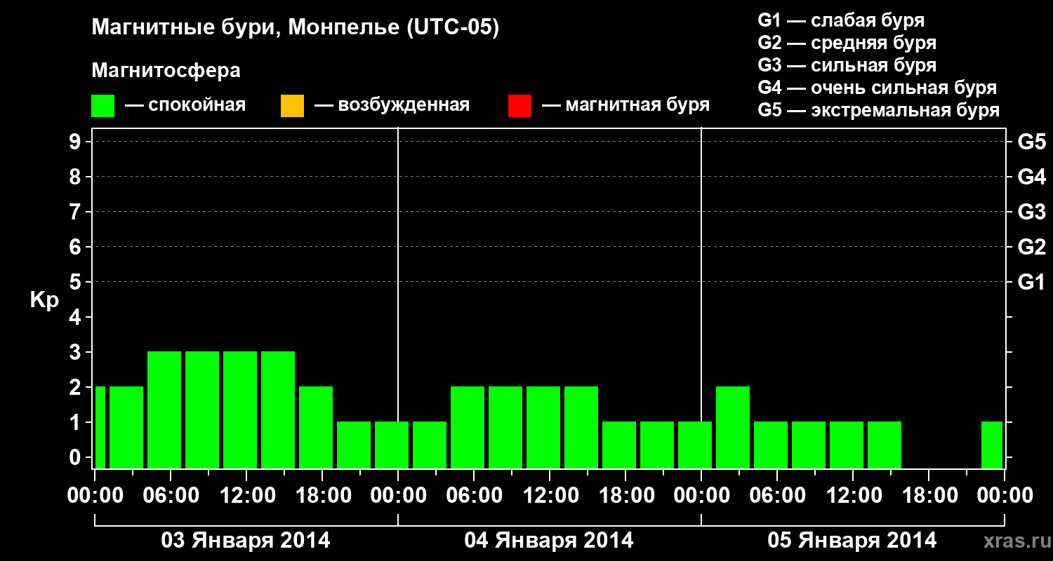 Изменения геомагнитного индекса Kp с 3 по 5 января 2014 года для средних широт