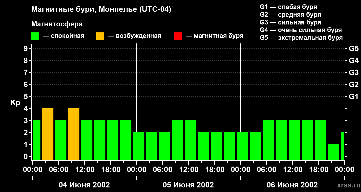 Изменения геомагнитного индекса Kp с 4 по 6 июня 2002 года для средних широт