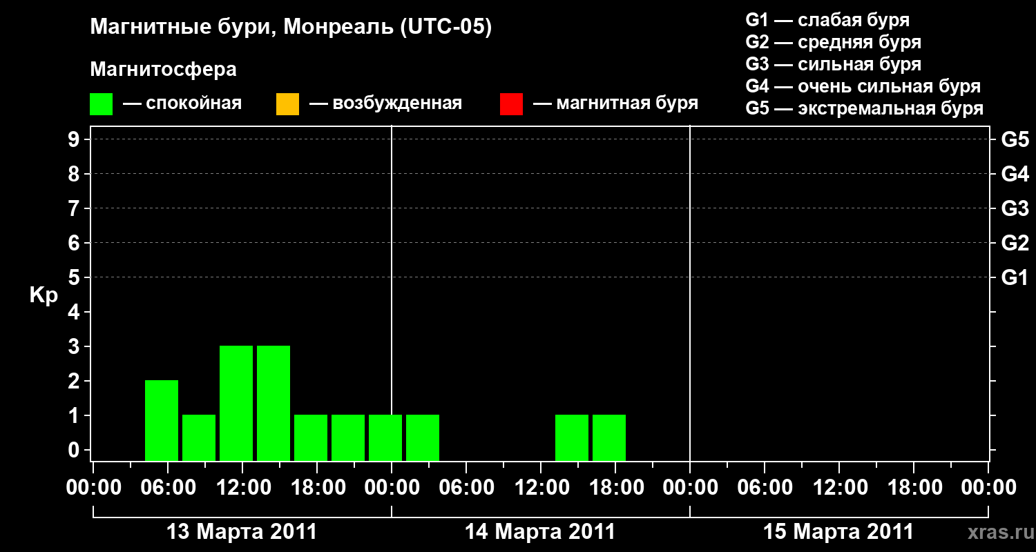 Изменения геомагнитного индекса Kp с 13 по 15 марта 2011 года для средних широт