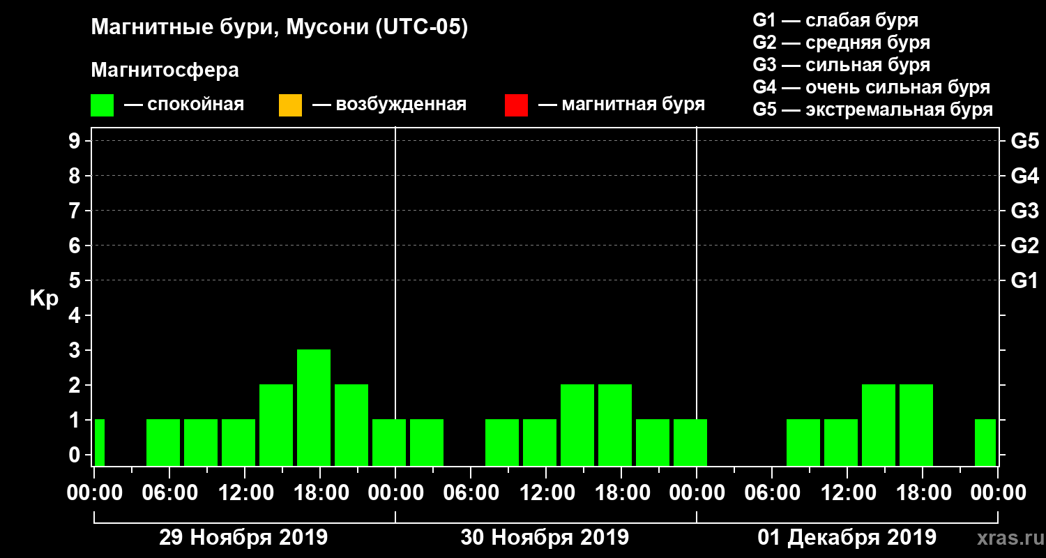 Изменения геомагнитного индекса Kp с 29 ноября по 1 декабря 2019 года для средних широт