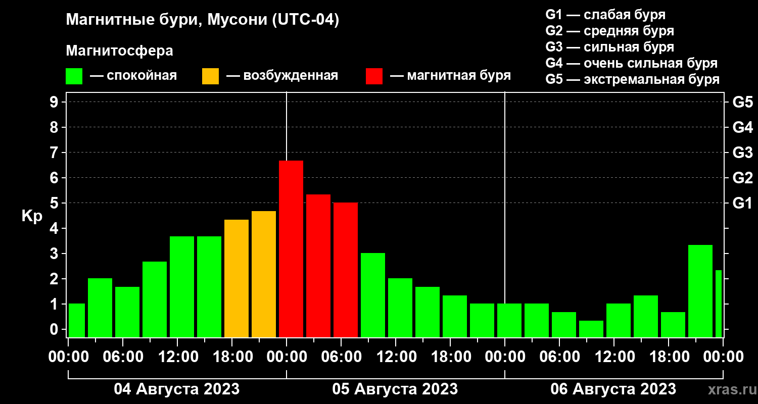 Изменения геомагнитного индекса Kp с 4 по 6 августа 2023 года для средних широт