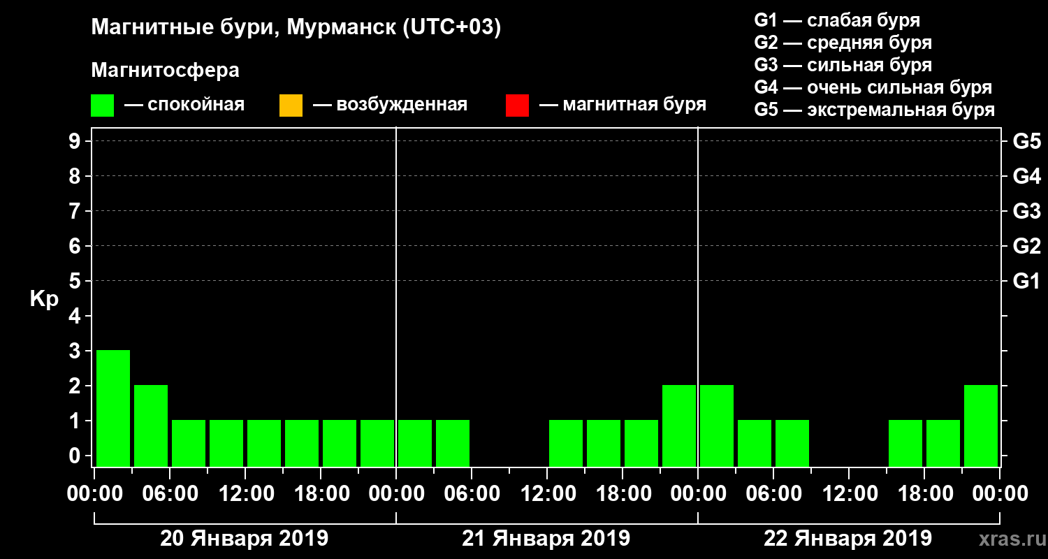 Изменения геомагнитного индекса Kp с 20 по 22 января 2019 года для средних широт