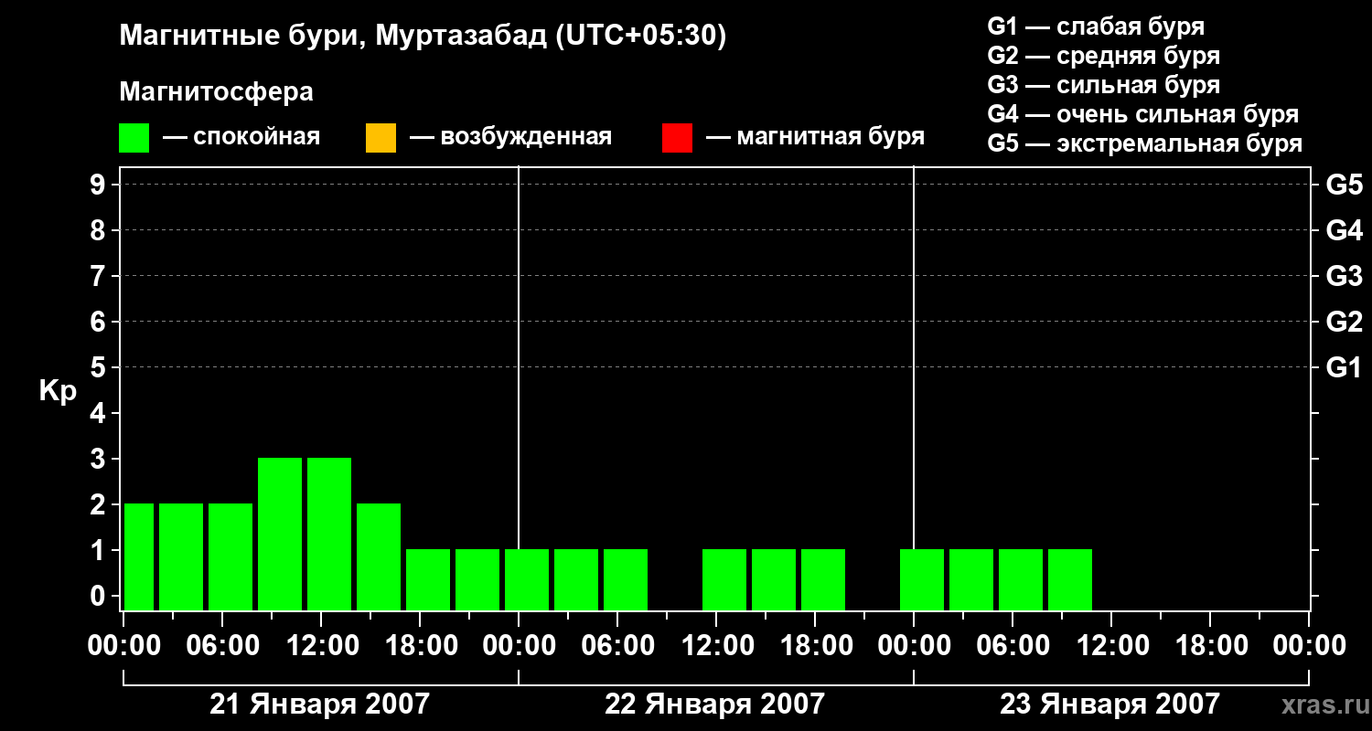 Изменения геомагнитного индекса Kp с 21 по 23 января 2007 года для средних широт