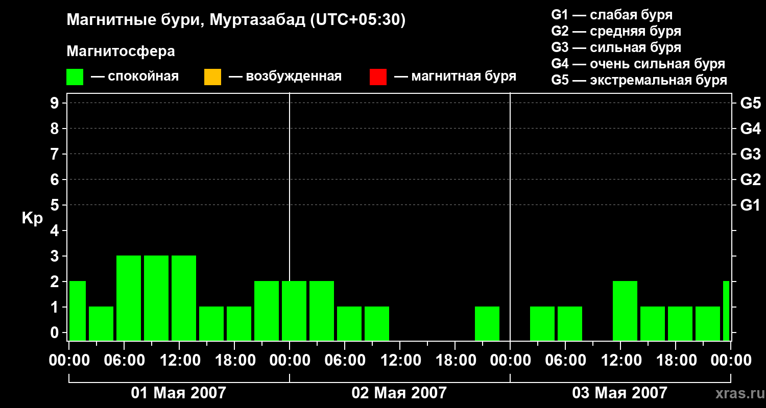 Изменения геомагнитного индекса Kp с 1 по 3 мая 2007 года для средних широт