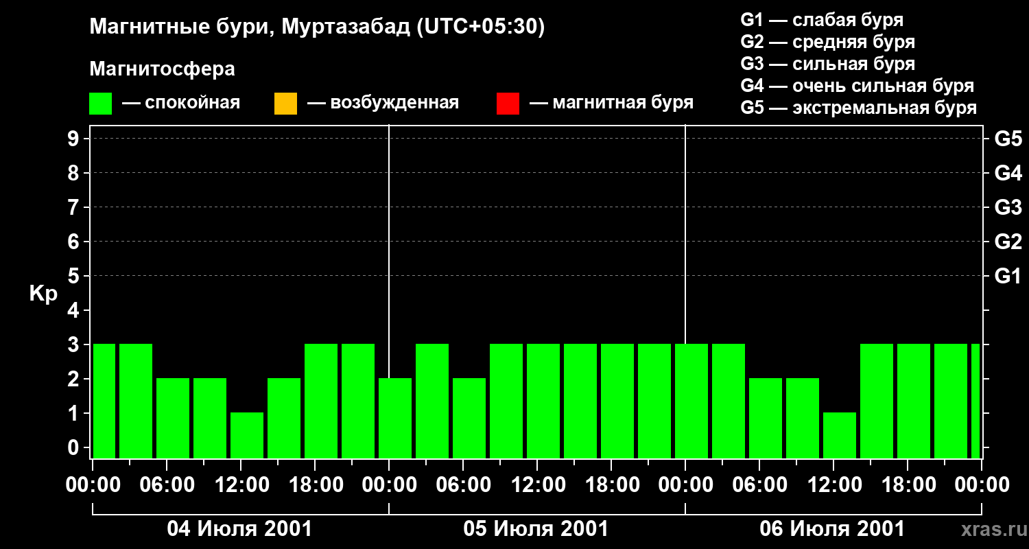 Изменения геомагнитного индекса Kp с 4 по 6 июля 2001 года для средних широт