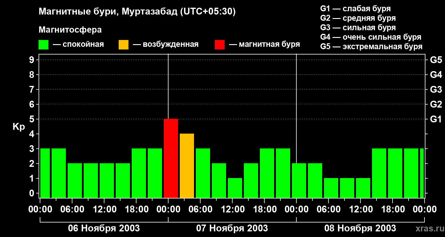 Изменения геомагнитного индекса Kp с 6 по 8 ноября 2003 года для средних широт