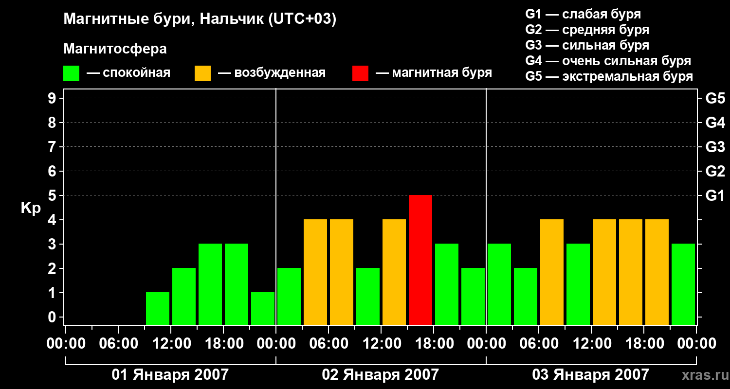Изменения геомагнитного индекса Kp с 1 по 3 января 2007 года для средних широт