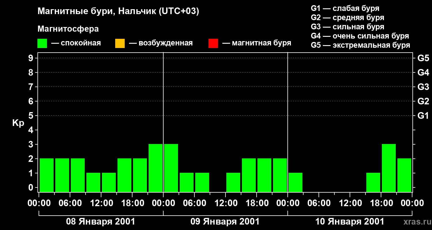 Изменения геомагнитного индекса Kp с 8 по 10 января 2001 года для средних широт