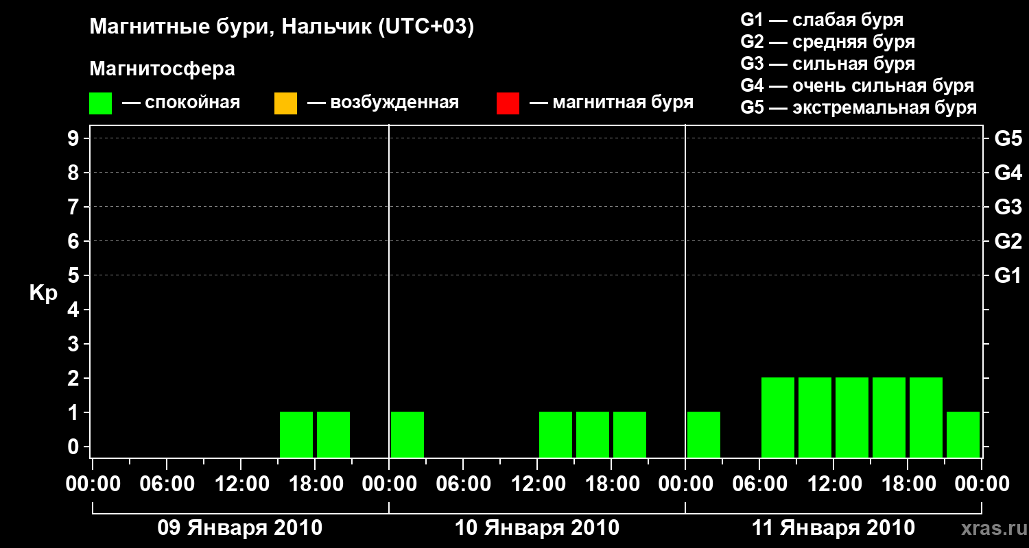Изменения геомагнитного индекса Kp с 9 по 11 января 2010 года для средних широт