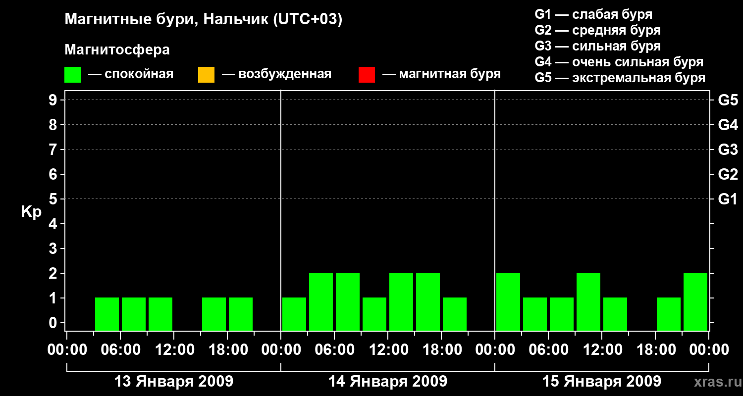 Изменения геомагнитного индекса Kp с 13 по 15 января 2009 года для средних широт