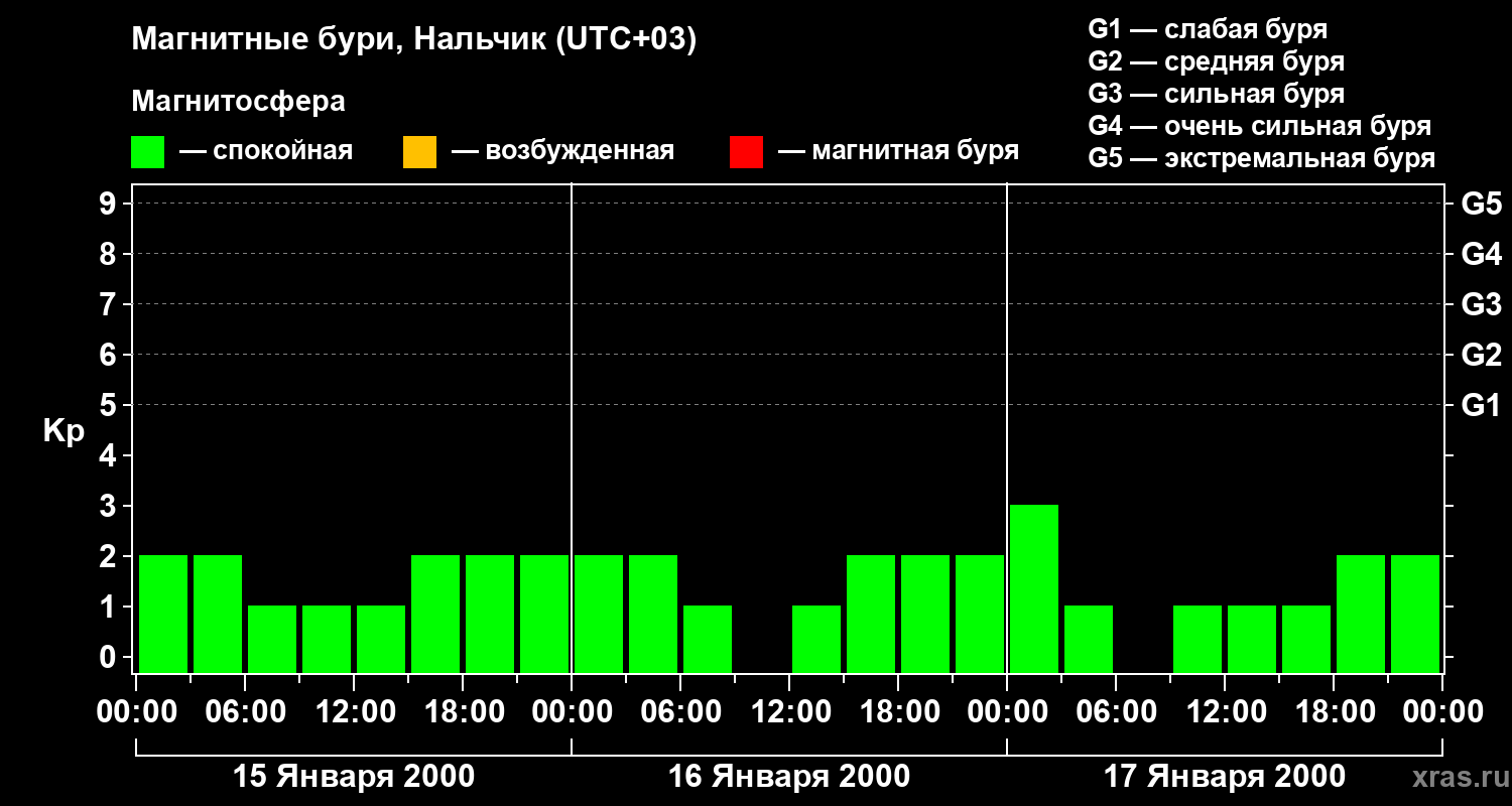 Изменения геомагнитного индекса Kp с 15 по 17 января 2000 года для средних широт