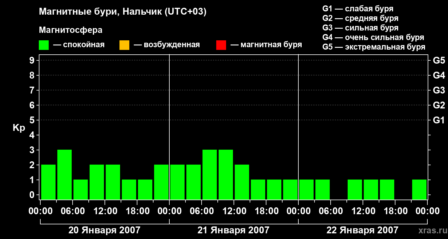 Изменения геомагнитного индекса Kp с 20 по 22 января 2007 года для средних широт