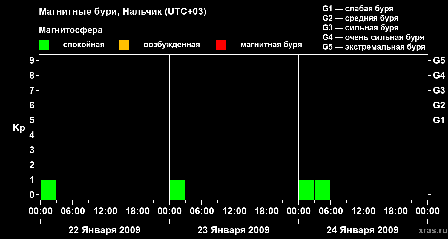 Изменения геомагнитного индекса Kp с 22 по 24 января 2009 года для средних широт